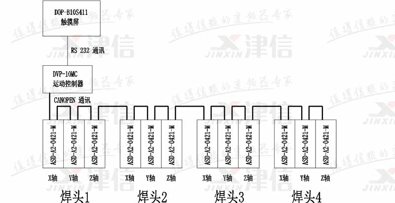 本方案針對多焊點塑料焊接設計。整套設備都由10MC控制,每個焊頭由3套A2伺服驅動器組合完成,實現空間上的X-Y-Z 3軸動作。,可以單焊頭或多焊頭組合,并且按照配方所規劃的路徑運動。