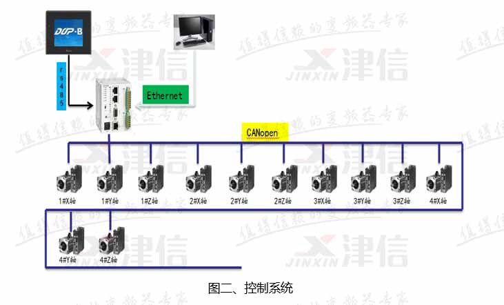10MC運動控制器的COM2口與DOP-B10E615觸摸屏通過RS485通訊,通過觸摸屏可以設置用戶工藝參數;控制器的CAN端口與A2伺服進行CANopen通訊,通過CAN總線控制伺服的運動及讀取伺服的狀態。